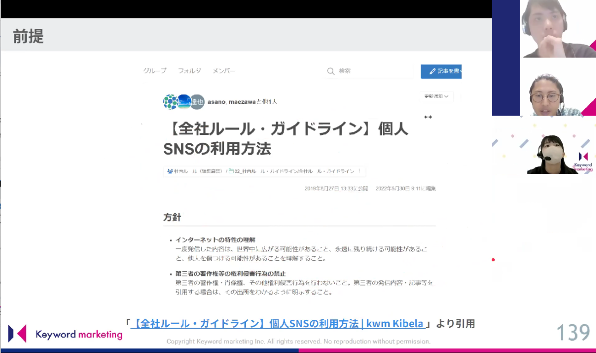 キーワードマーケティングは、メンバーの SNS 利用を推奨しており、社内ルールの整備や、全社ミーティングでの啓蒙を行っています。